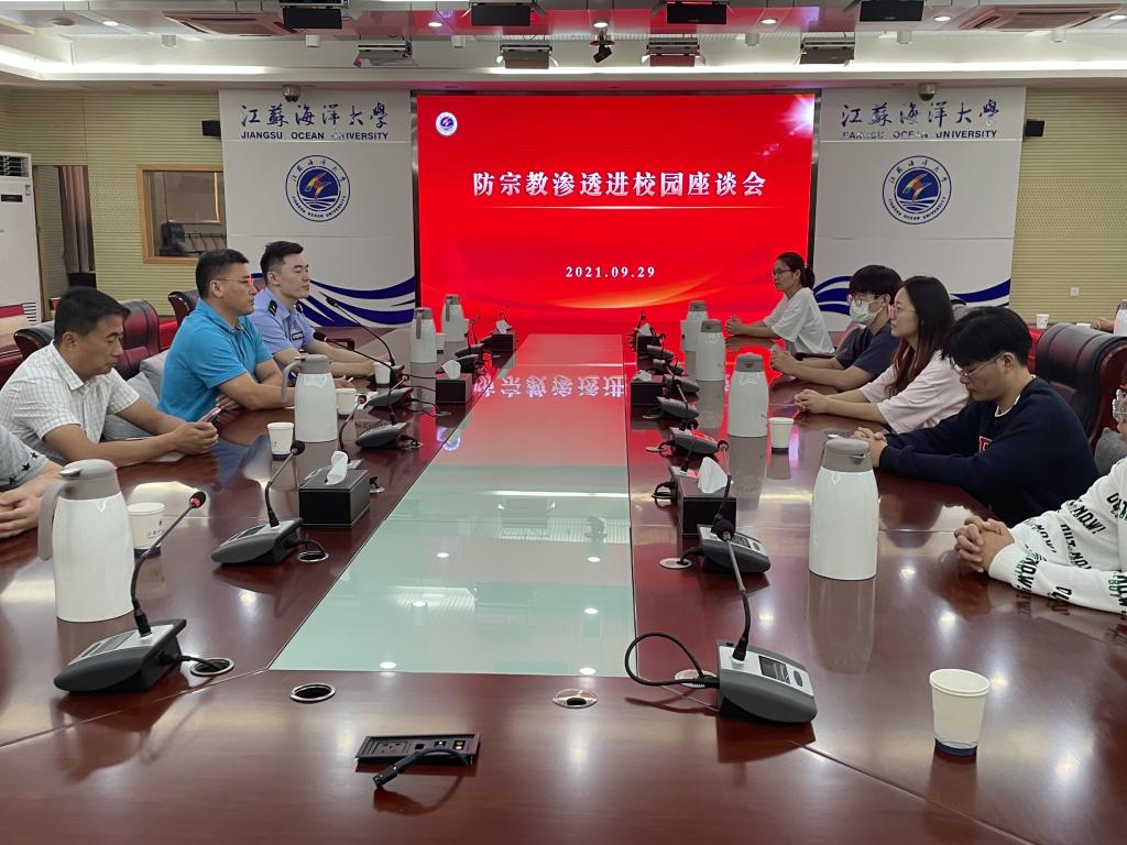 为抵御和防范宗教活动向校园渗透,维护校园秩序,聚焦正能量,引导学生正确认识宗教,构建良好的校园文化氛围。9月30日上午,江苏海洋大学理学院联合保卫处在学术会议中心东海厅举办了防宗教渗透进校园座谈会,本次会议邀请学校辖区派出所杨警官作专题报告,由保卫处处长马超主持,出席会议的还有保卫处综合科主任赵玉波,理学院团委副书记刘丰瑞以及理学院学生代表。