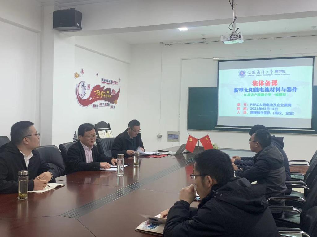 3月14日,理学院召开江苏省产教融合型一流课程—新型太阳能电池材料与器件课程建设推进会。推进会分两个阶段进行,第一阶段是课程团队(高校、企业)进行集体备课和讲座交流,第二阶段是企业课程负责人(江苏省产业教授)课堂授课。