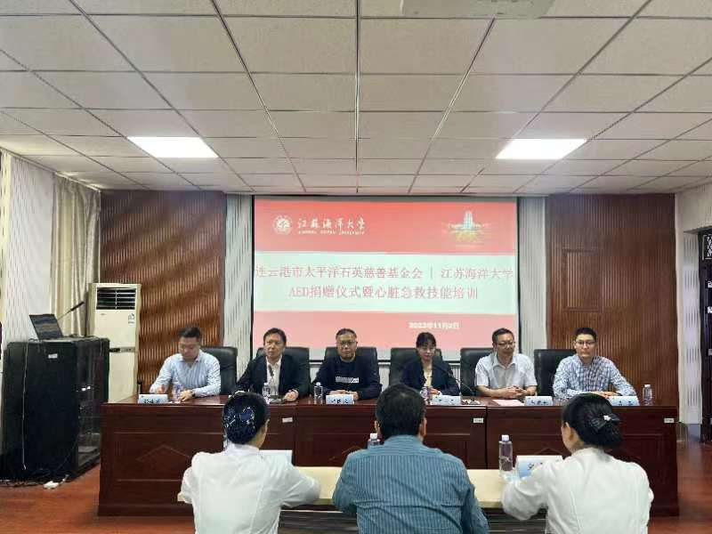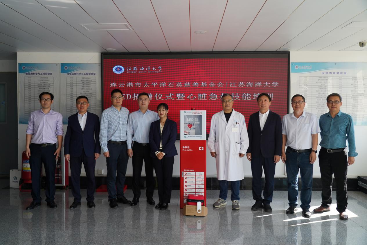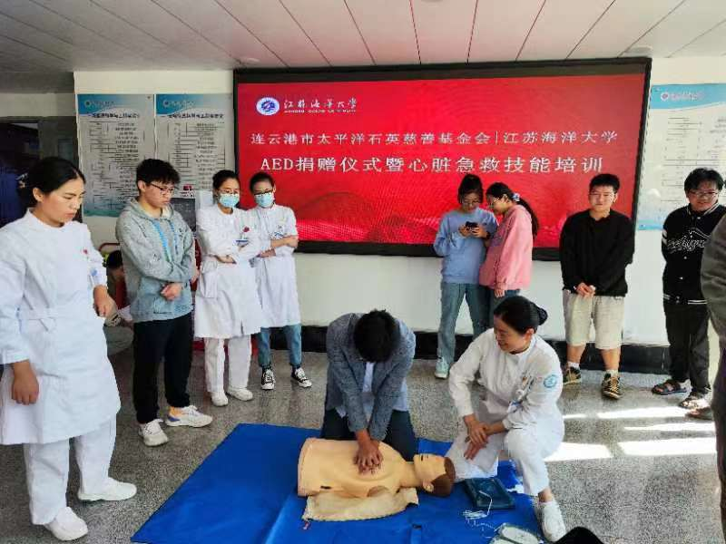 在此次活动中,连云港太平洋⽯英慈善基⾦会秘书长王云霞协两位理事为我们捐赠了一台AED除颤仪。现场捐赠AED(含便携包)1台,AED⽴柜1个,急救包1个。