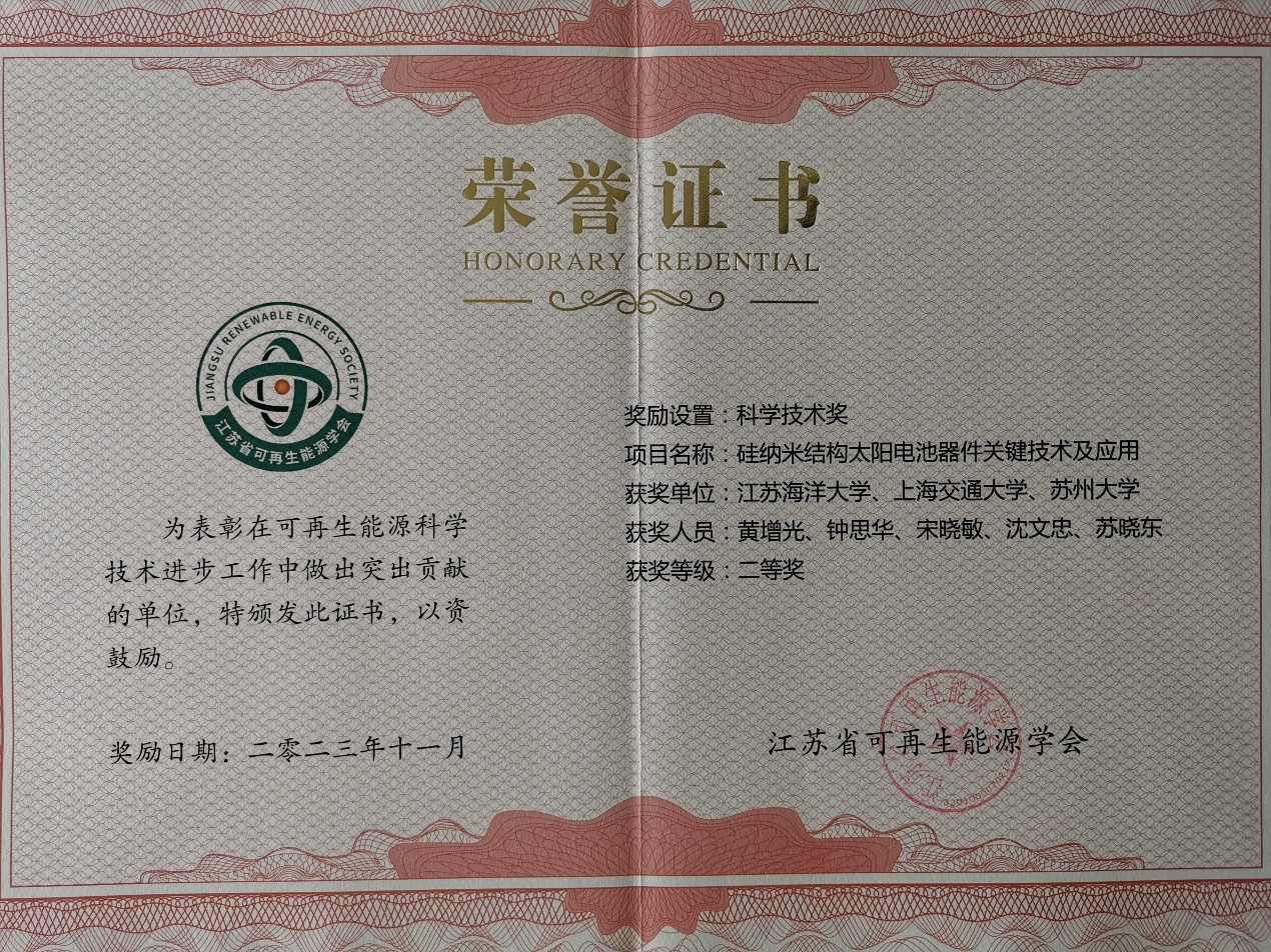 近日,江苏省可再生能源学会在南京举行2023年学会科学技术奖颁奖典礼,我校理学院黄增光教授团队项目“硅纳米结构太阳电池器件关键技术及应用”荣获科学技术二等奖,江苏海洋大学为第一完成单位,理学院黄增光为第一完成人。