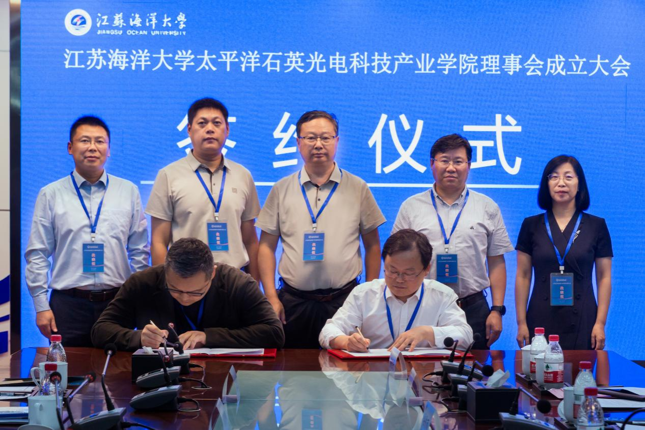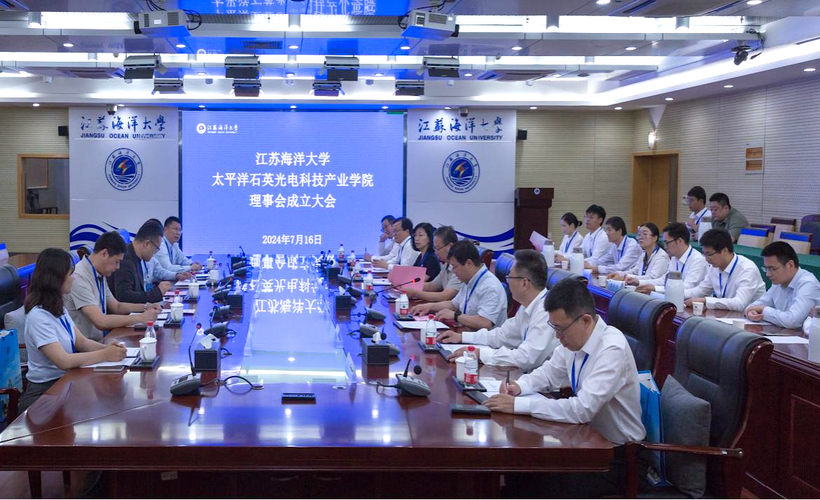 7月16日上午,江苏海洋大学-太平洋石英光电科技产业学院理事会成立大会在苍梧校区会议中心隆重举行。江苏海洋大学校长宁晓明,连云港市太平洋石英慈善基金会理事长陈富伦,江苏太平洋石英股份有限公司副总裁刘明伟等合作单位代表,以及江苏海洋大学教务处处长安俊丽,理学院党委书记张振松、院长史林兴等理学院领导班子、骨干教师出席会议,会议由江苏海洋大学副校长马廷淮主持。