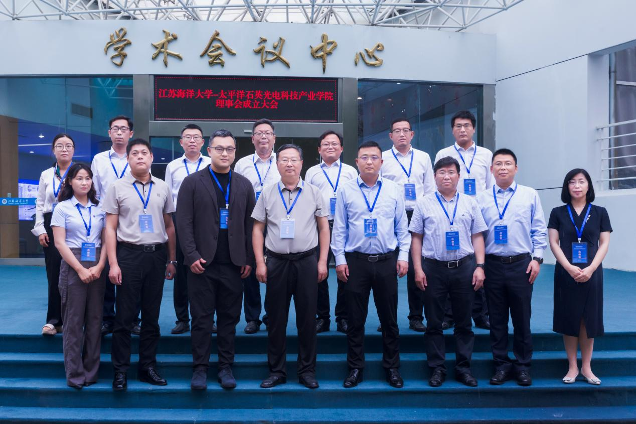 最后,全体与会人员在会议中心大门口合影留念。此次大会的召开,旨在推动校企合作,共谋发展,标志着江苏海洋大学与江苏太平洋石英股份有限公司在人才培养、科学研究等方面的合作迈出了新步伐,希望以产业学院为共建基地,为光电科技领域培养更多高素质人才,为光电科技产业发展注入新的活力。