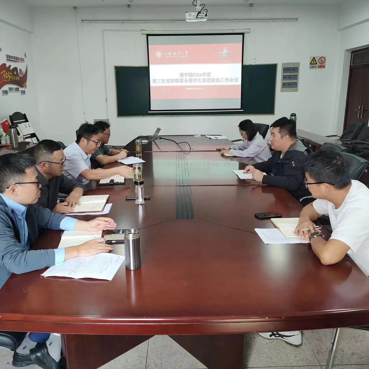 9月25日上午,理学院在定海楼516室召开2024年度第三次党团联席会暨学生思想政治工作会议,理学院党委书记张振松主持会议,学院党委委员,全体辅导员,团委学生组织负责人以及学生会主席团参加。
