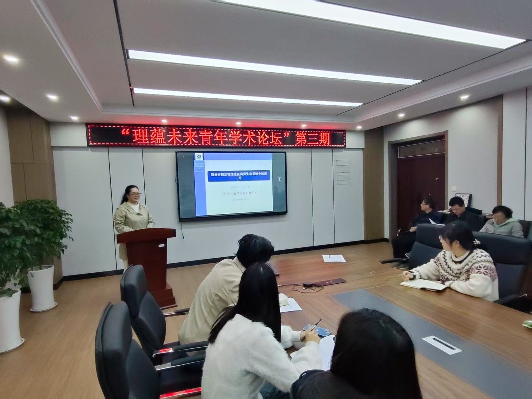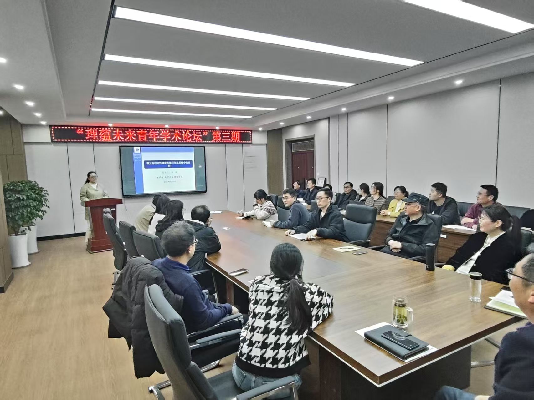 为践行理学院以学术创新赋能海洋科技发展的实践路径,4月2日下午,学院举办第三期“理蕴未来青年学术论坛”。本期论坛以“海洋数学+赋新海洋生态:聚焦基于数学工具的生态机制解码”为主题,通过专题报告与学术研讨相结合的形式,持续深化青年教师对学科交叉价值的认知。数学学科优秀学者杨洪博士担任主讲嘉宾,院长史林兴教授主持,全体青年教师积极参与。活动现场学术氛围浓厚,充分展现了青年学者的科研活力与创新思维。