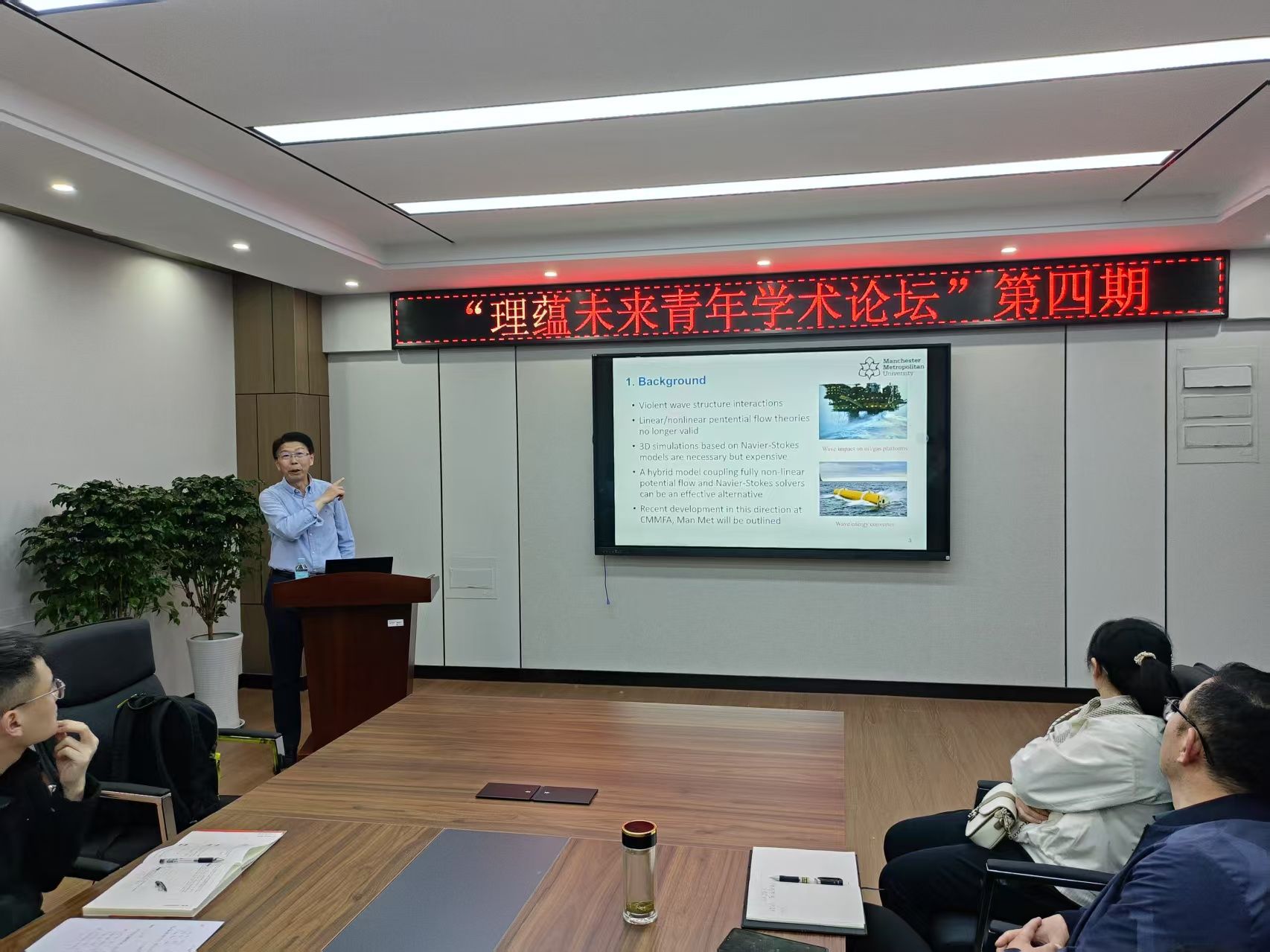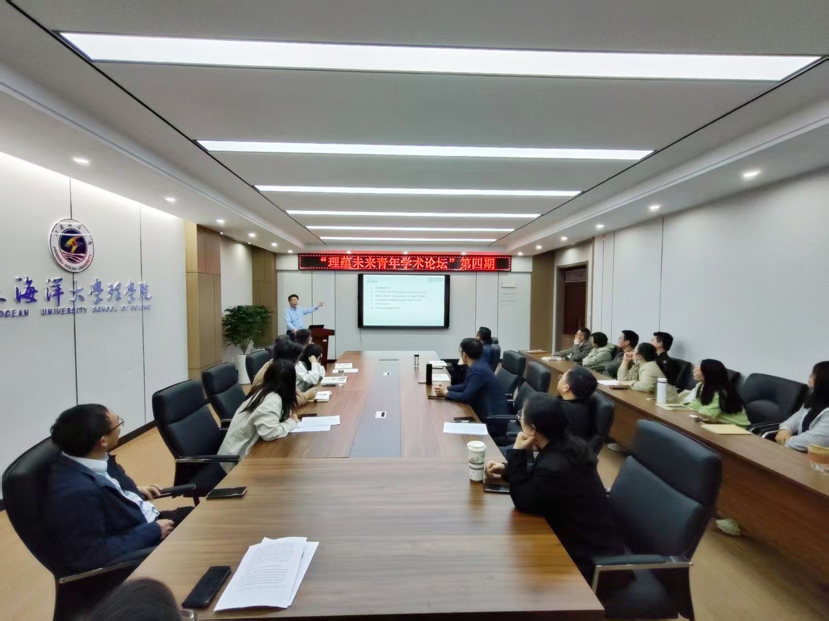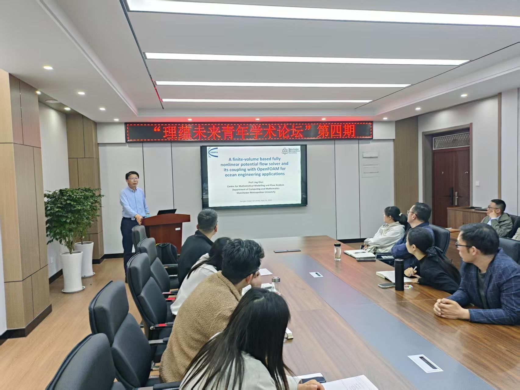论坛最后,史林兴作总结讲话。他指出,本期论坛以“海洋国际+”为纽带,精准锚定三大价值维度:一是聚焦海洋势流理论创新,解码数值模拟技术对海洋工程研究的范式突破;二是强化学科交叉融合,通过前沿研讨激荡思维,直击数学物理方法与海洋科技深度融合;三是深化“海洋+”战略纵深推进,以理论-技术-应用的全链条创新赋能学科生态升级。他强调,系列论坛持续聚焦“海洋+”学科群建设,既彰显了数学、物理等基础学科与海洋科技深度融合的战略价值,也为青年教师锚定国家“海洋强国”需求、探索跨领域协同创新提供了实践范式。钱岭教授作为曼彻斯特城市大学的国际知名学者,其研究成果不仅为学院学科发展注入前沿视角,更通过国际化科研合作网络,推动“海洋+”学术品牌与国际海洋科技前沿接轨。学院将持续以学术品牌为引擎,加速构建“基础研究夯基垒台、技术攻关立柱架梁、工程应用积厚成势”的科研生态,并通过深化国际学术交流,拓展联合攻关与人才共育路径,为服务海洋产业高质量发展注入兼具国际视野与本土实践的理学院智慧。
