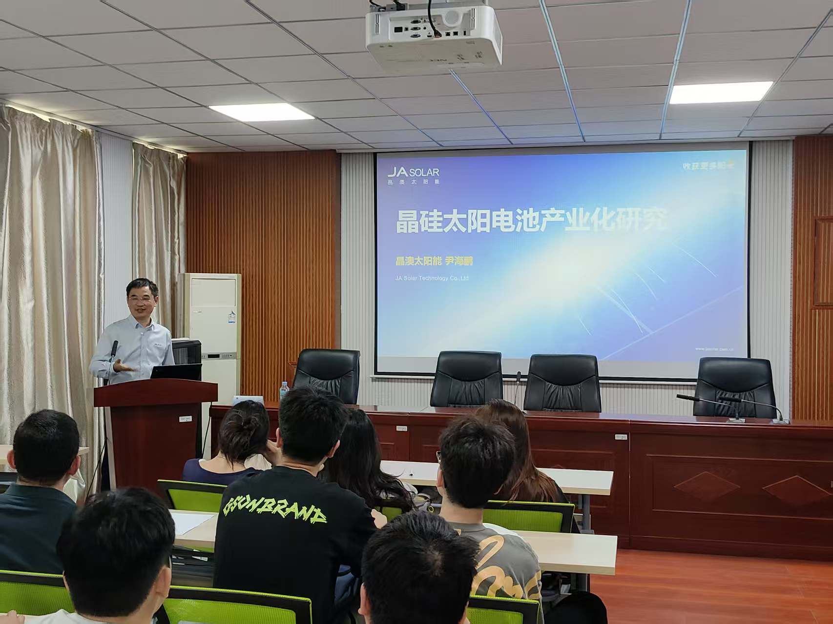 聘任仪式后,尹海鹏为新能源科学与工程专业本科生讲授了《晶硅太阳电池产业化研究进展》产业教授进课堂示范课。他通过产线实景视频、工艺参数解析和失效案例分析,生动地展现了从实验室研发到GW级量产的技术跃迁。为学生直观地阐释了理论公式背后的产业逻辑,使学生们对光伏行业的技术迭代有了全新的认知。课堂气氛活跃,课后讨论环节学生争相提问问题,尹海鹏为同学们做了详细解答,并鼓励学生脚踏实地、锻炼本领,为我国清洁能源产业,特别是光伏产业发展做贡献。