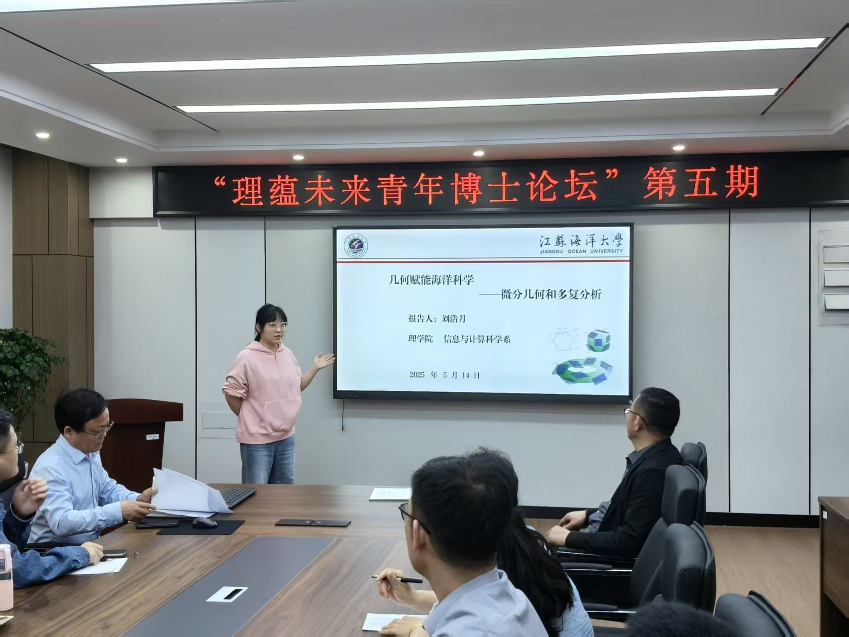 第五期“海洋信息+”论坛作为本轮系列收官之作,以“数据驱动技术赋能海洋科学”为核心,聚焦信息科学与海洋科技深度融合的前沿探索。信息与计算科学系刘浩月博士以“微分流形与信息科学协同驱动的赋能海洋科学研究”为主题,创新性引入微分流形理论,构建高维流形上的非线性动力学方程,精准刻画洋流多尺度运动特征及能量传递机制,其提出的基于Kähler流形理论的智能解析算法,结合复变函数方法,显著提升海底地形反演与矿产资源识别精度。报告还系统阐释几何理论与人工智能的融合前景,探索利用深度学习优化流形参数校准的可行性,为破解海洋复杂系统的建模难题开辟“数据驱动”新路径,标志着“海洋信息+”学科交叉迈入纵深发展阶段。