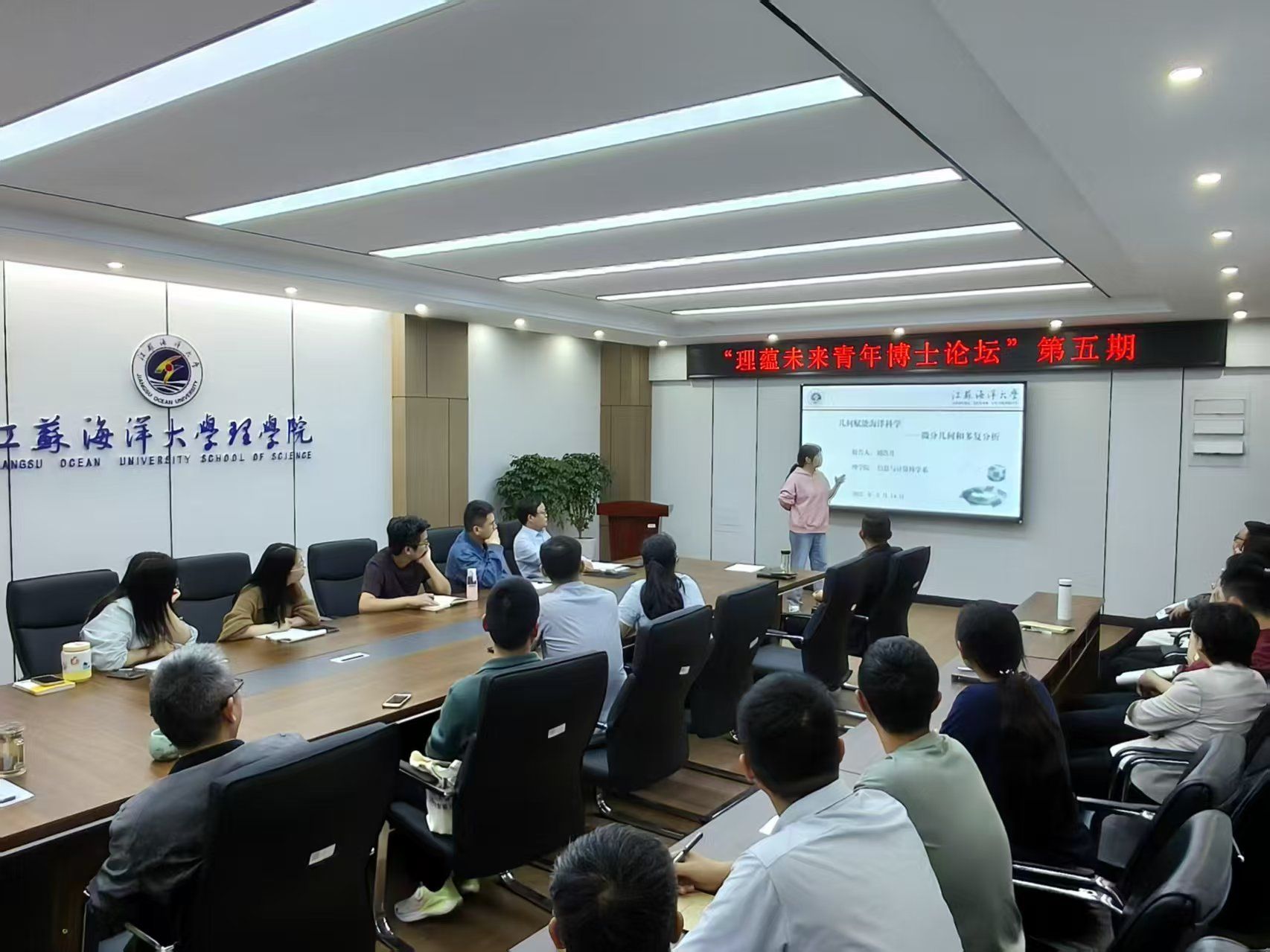首期论坛以“海洋能源+创新路径探索”为主题,由新能源科学与工程系张原原博士主讲,系统解析光催化材料在海洋环境治理与能源开发中的应用潜力,提出光热海水淡化、光催化制氢等创新路径,为海洋资源高效利用提供新思路。第二期“海洋光电+”聚焦深海探测技术,光电信息科学与工程系黄保坤博士展示了自主研发的“7000米级深海拉曼光谱系统”,通过原位无损检测技术突破深海极端环境下的资源勘探瓶颈。第三期“海洋数学+”由数学与应用数学系杨洪博士领衔,基于微分方程定性理论,解码海洋生态系统动态平衡机制,为赤潮预警与渔业资源管理提供数学支撑,凸显数学工具在生态治理中的核心价值。第四期“海洋国际+”特邀曼彻斯特城市大学钱岭教授,探讨三维海洋势流数值模型的构建与应用,其团队研发的“全非线性势流数值水池模型”攻克了海洋工程中多尺度流固耦合模拟难题,彰显国际合作对技术突破的推动作用。
