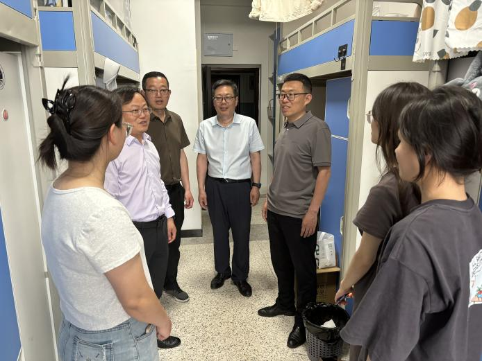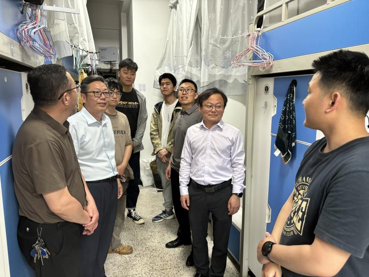 会议结束后,学院领导班子一行前往研究生宿舍,对学院研究生宿舍进行逐个安全巡查。走访过程中,张振松特别强调宿舍安全的重要性,提醒同学们注意用水用电安全,营造和谐宿舍环境。