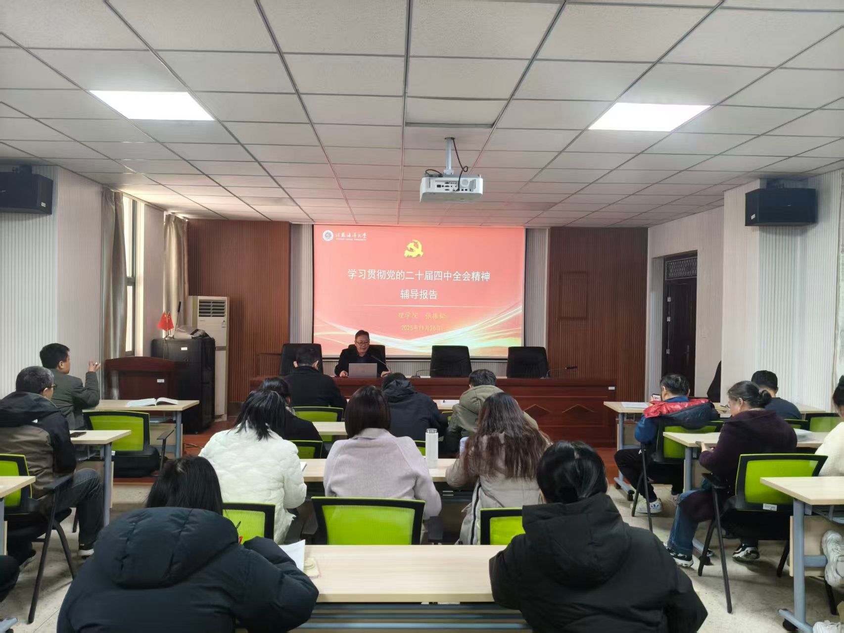 11月26日,理学院召开全体教职工会议,专题学习二十届四中全会精神及《中国共产党思想政治工作条例》(以下简称《条例》)内容,学院党委书记张振松结合学院实际,就如何全面把握好、贯彻落实好全会以及关于《条例》做出的新部署新要求,作了系统宣讲和深入阐释。