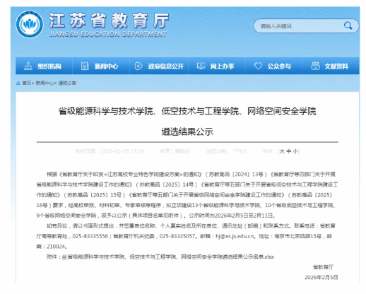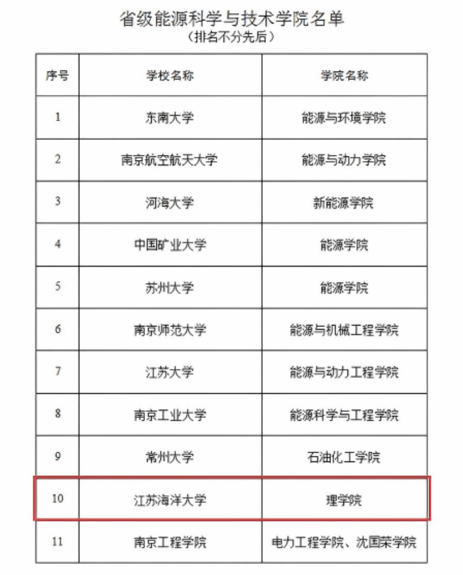 近日,江苏省教育厅发布省级能源科学与技术学院、低空技术与工程学院、网络空间安全学院遴选结果公示,江苏海洋大学理学院联合环境与化学工程学院成功获批省级能源科学与技术学院立项建设,成为全省13个拟立项建设的该类学院之一。此次获批是学校全面贯彻党的二十大和二十届历次全会精神,落实教代会发展思路,深化高等教育综合改革的重要阶段性成果,更是理学院立足海洋特色、服务国家能源战略的关键突破。