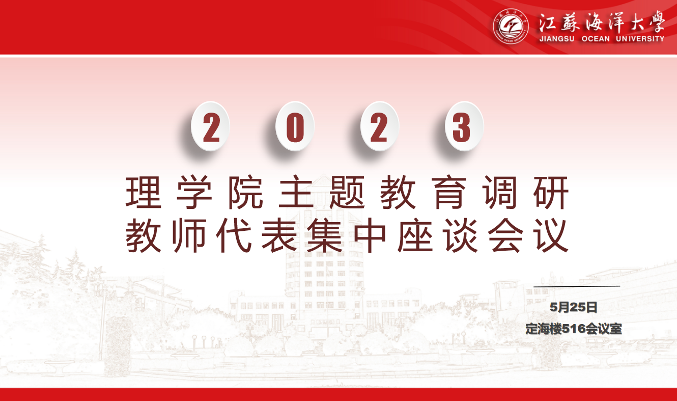 按照我校主题教育调研安排统一部署,为全面贯彻落实中央及省委关于大兴调查研究的相关工作要求及《中共江苏海洋大学委员会关于开展学习贯彻习近平新时代中国特色社会主义思想主题教育调查研究的实施方案》文件精神,5月25日下午,理学院主题教育调研教师代表集中座谈会在定海楼516会议室举行,学院领导班子、各系主任、支部书记、党政办公室以及教师代表共同参加会议,会议由党委书记张振松主持。