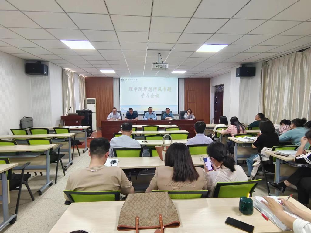 5月31日下午,学院开展学习贯彻习近平新时代中国特色社会主义思想主题教育暨理学院师德师风专题学习会,全体教职工参加,院党委书记张振松同志主持会议。