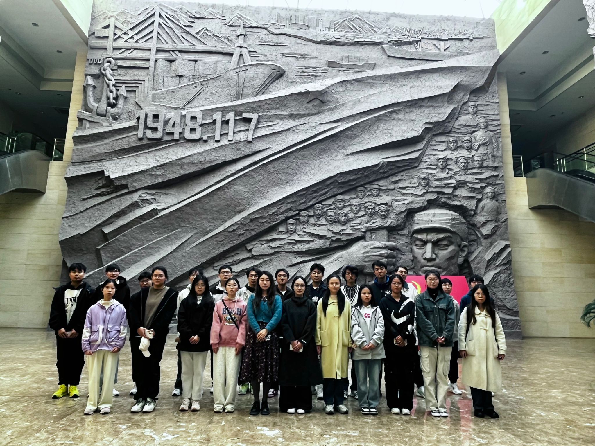 在纪念馆内,同学们首先被大厅门口的一面印着“1948.11.7”的浮雕所吸引,这是连云港地区彻底解放的日子,浮雕旁是四个震撼人心的纪念碑,分别象征着“觉醒”、“抗争”、“卫国”和“解放”,仿佛在诉说着那段烽火连天的岁月。在辅导员张慧婧的带领下,同学们怀着崇敬的心情依次参观了各个展厅,从五四运动到抗日战争,再到新中国的成立,一幅幅珍贵的照片、一件件历史文物和一段段感人至深的革命故事,都记录先烈们在连云港大地上不屈不挠的斗争历程。