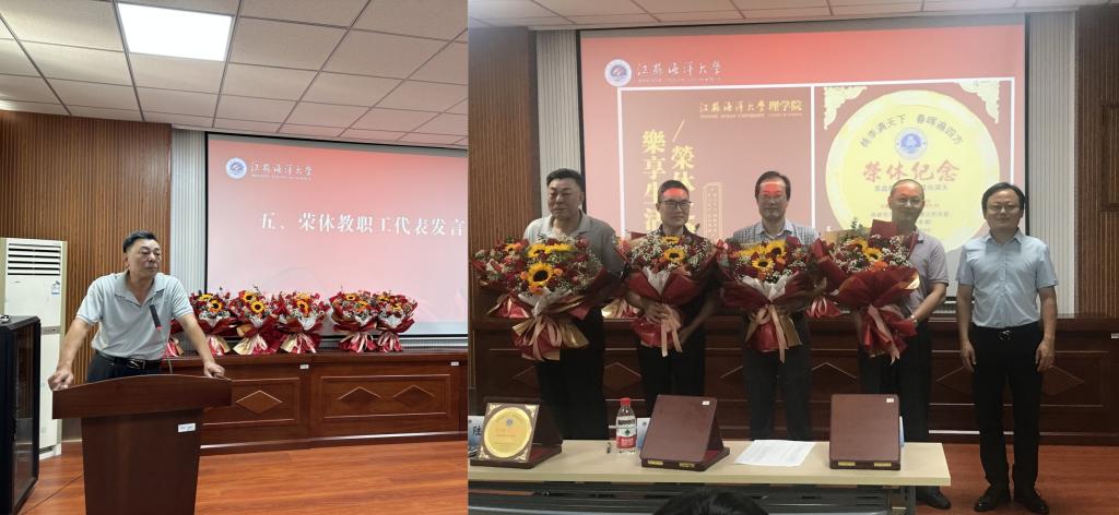 党委书记张振松宣读荣休人员名单并为6位老教师颁发荣休奖章。院长史林兴向荣休教师献上鲜花,并合影留念。李新华老师作为荣休教师代表上台发言,他从四个方面回顾自己职业生涯,对学校事业发展取得的巨大成就引以为傲。