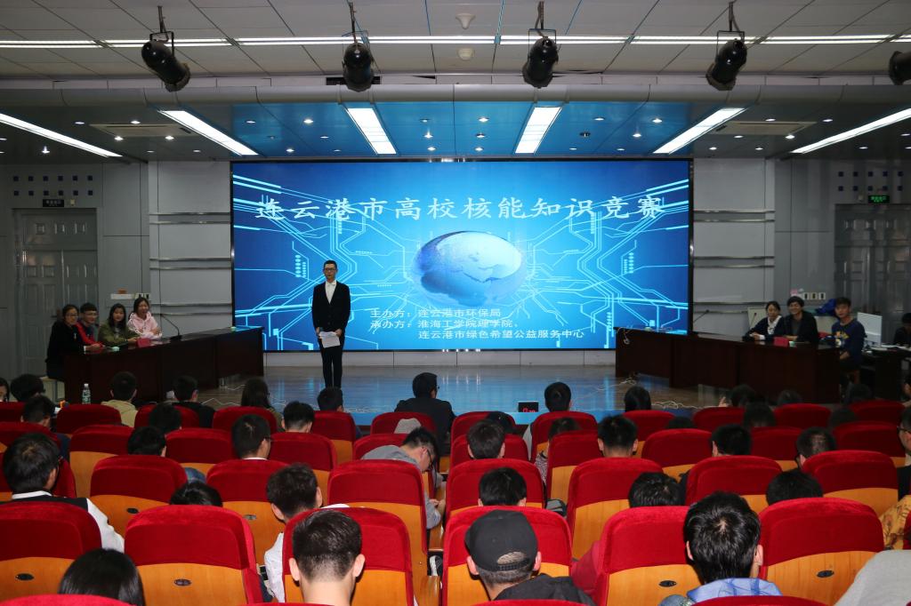 10月22日晚七时,由连云港市环保局主办,淮海工学院理学院与连云港市绿色希望公益服务中心共同承办,以宣传核能知识,提高高校学生科学素养为目的的连云港市高校核能知识竞赛在淮海工学院苍梧校区艺术楼报告厅举行。