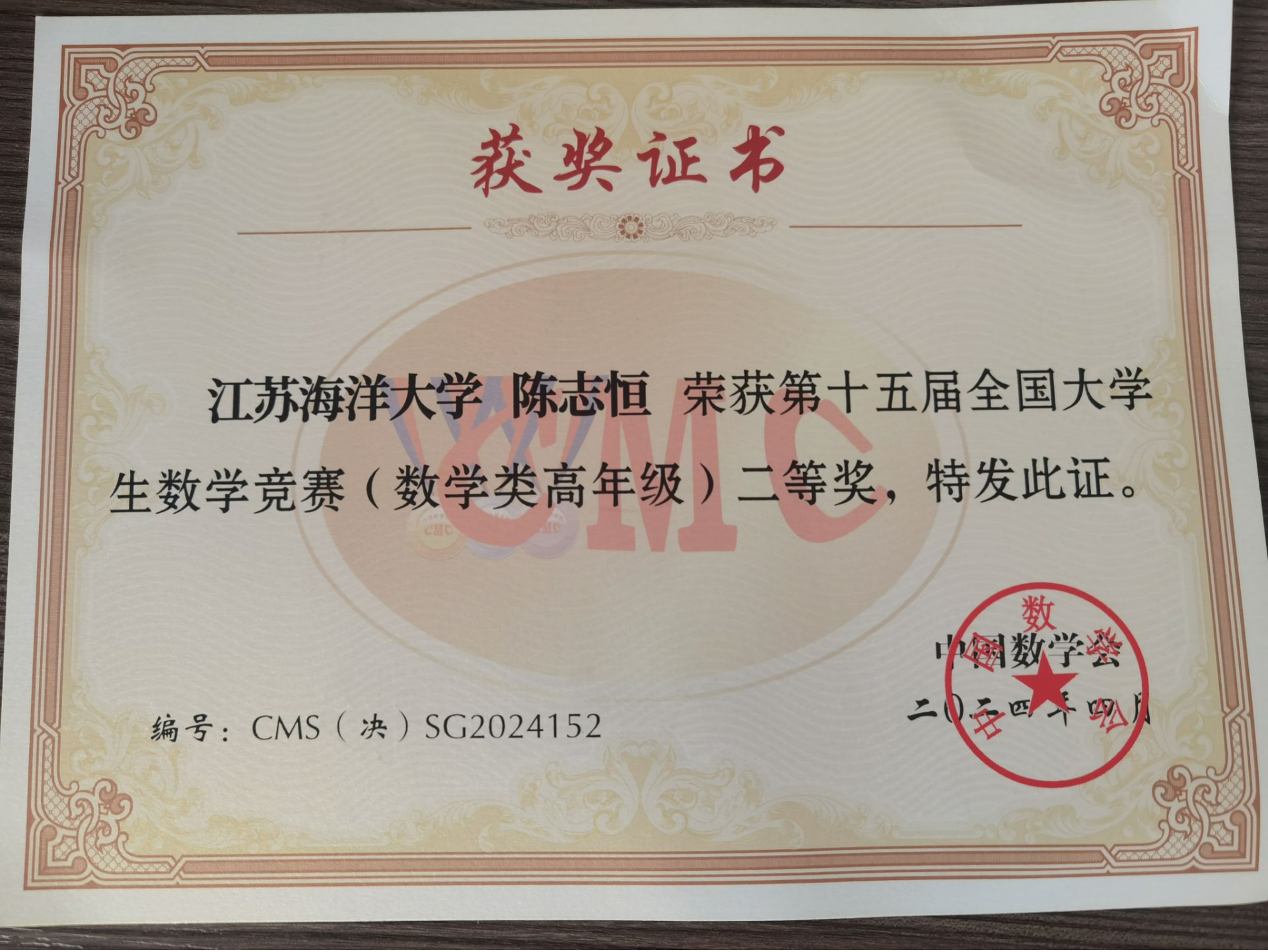近日,第十五届全国大学生数学竞赛决赛在山东大学顺利举行,江苏海洋大学理学院数学专业20级学生陈志恒在比赛中获数学类高年级组全国二等奖,为我校首次获得该奖项。