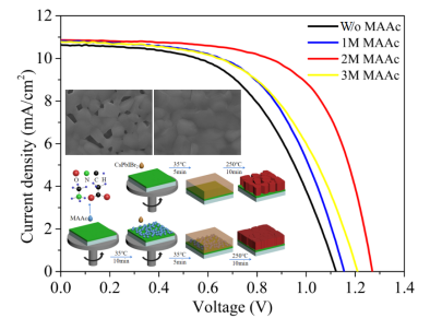 近期,我院光电转换能源材料与器件团队在国际权威期刊ACS Applied Energy Materials(影响因子6.024)发表题为“MAAc Ionic Liquid-Assisted Defect Passivation for Efficient and Stable CsPbIBr2Perovskite Solar Cells”的论文,报道了MAAc离子液体对高效稳定CsPbIBr2钙钛矿太阳电池的缺陷钝化。