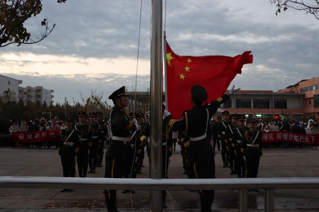 6点30分,英姿飒爽的国旗护卫队在全体师生的瞩目下迈着整齐的步伐进场,在庄严雄壮的国歌中,鲜艳的五星红旗冉冉升起。