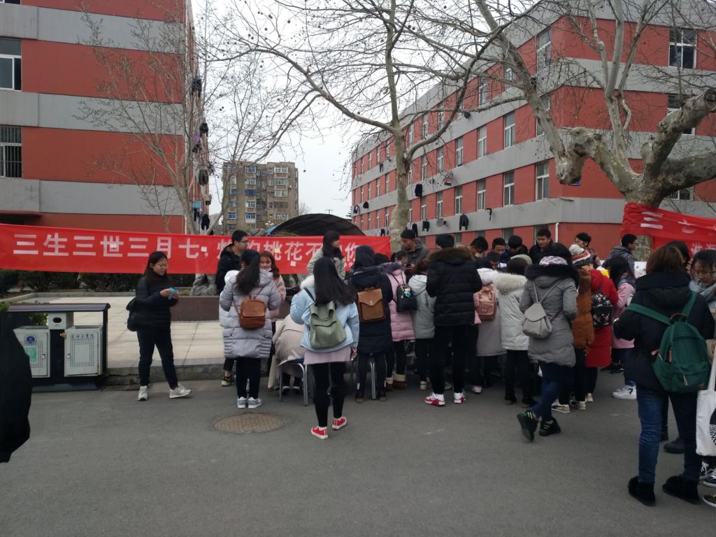 3月7日,理学院学生会以“三生三世三月七,灼灼桃花不如你”为主题开展女生节活动。活动在通灌校区前程餐厅门口举行,参加此次活动的是来自理学院的大一同学们。