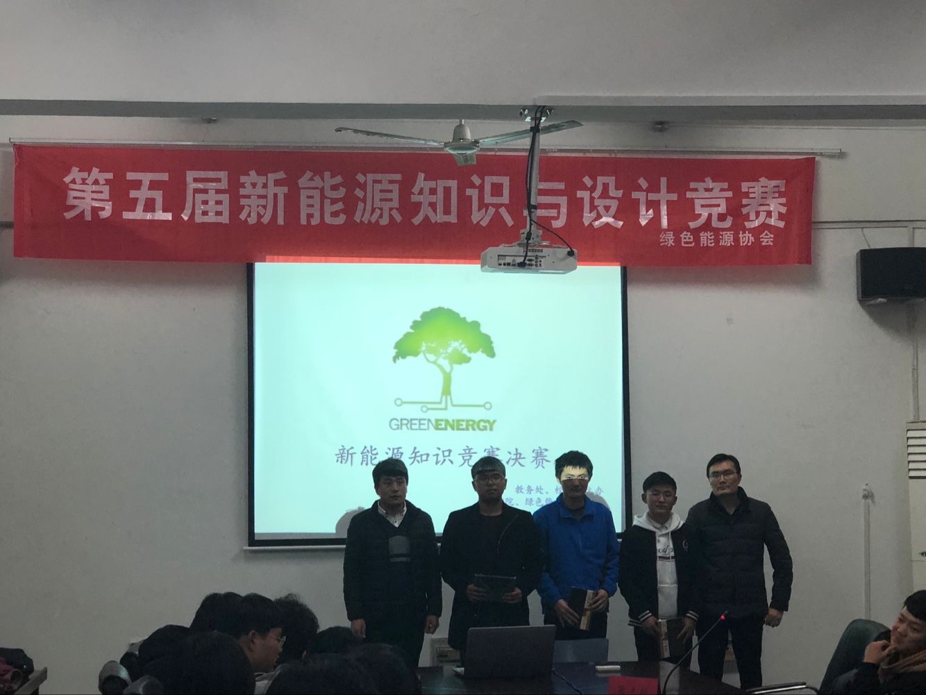 11月30日7时,由大学生绿色能源协会举办的第五届新能源知识与设计竞赛决赛在苍梧校区文渊楼理学院会议室举行。本次大赛的评委有连云港市新能源行业协会秘书长陈双喜,理学院副院长史林兴、理学院新能源科学与工程专业带头人邵理堂、理学院新能源科学与工程系主任刘学东、副主任孙庆强、理学院新能源科学与工程系丁瑞强博士和刘珠伟博士。