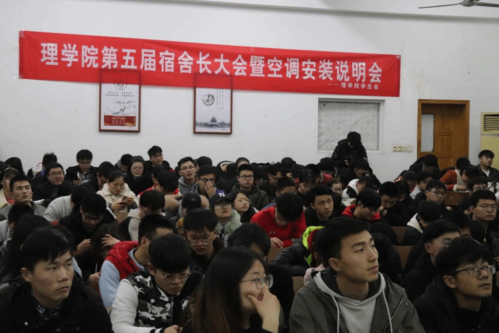 3月10日晚,理学院第五次宿舍长大会暨空调安装说明会于本部文通楼A102隆重召开,我院辅导员刘丰瑞主持会议,理学院全体宿舍长及各班班长出席会议。
