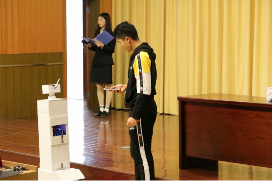 理学院组织评审专家对初审合格的竞赛作品进行现场评审,经过评委讨论后确定了得奖作品,并由主持人为获奖人颁发竞赛获奖证书。一等奖:王志鹏团队的“迈克尔干涉仪自动测量系统”、郭鹤魁团队的“家庭智能机器人”和刘徐强团队的“受下落式节奏触摸类游戏启发的打击类装置设计”;二等奖:赵珞迦团队的“智能化便携式多功能水果采摘机”、万志良团队的“物流车的设计与制作”、傅子杨团队的“仿生鱼尾鳍的制作”和缪涵团队的“新型发光材料”;三等奖:徐舒成团队的“智慧护栏灯”、王壮壮团队的“基于无人船的水质检测系统的设计”、柯佳程团队的“基于视觉模块与GPS混合系统的公路巡检机器人”、张科团队的“多用途桌面级机械臂的设计”和王文硕团队的“智能化车体缺陷检测系统”。最后,由袁冬青老师进行总结陈词,本次大赛也就此落下帷幕。