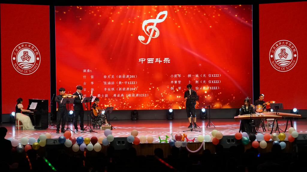 晚会欢声不断,惊喜不停,以《中西斗乐》为代表的大部分节目与以往不同,完全由理学院学生演奏演唱,民乐的笛箫和西乐的小提琴碰撞,古筝和单簧管、钢琴共鸣,从学院文艺队同学演唱的《晴天》、《十年》到大一新生五十多名代表组成的大合唱《夜空中最亮的星》,展现了学院在文化建设中取得的成效,丰富的文娱活动形成了阳光向上的院风院景。