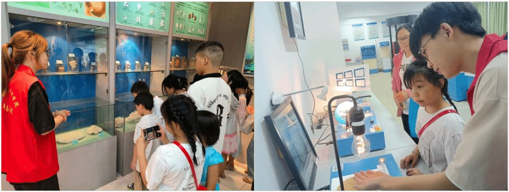 在趣味物理实验馆中,孩子们聚精会神的看着志愿者哥哥姐姐们的操作和演示,随即三五一组尝试了飞机升力、能量穿梭机、混沌摆、万花筒等科学实验,不仅感受到了科学的神奇与魅力,还锻炼了他们的动手能力、逻辑思维能力以及团队合作精神。在海洋馆中,志愿者进行以“保护海洋生态”为主题的讲解,为孩子们介绍了各种关于海洋生物、海洋保护、海洋科学研究等相关海洋科普知识,呼吁大家要时时刻刻保护海洋生态环境。孩子们还认真观察了许多海洋生物标本和金属矿物,如中华鲟、大白鲨、孔雀石等,通过实践和参观,孩子们对科学和自然有了更深入的认识和理解,趣味物理实验和海洋科普在他们幼小的心灵中埋下了科学的种子,相信未来定会在建设海洋强国的征程上开花结果。