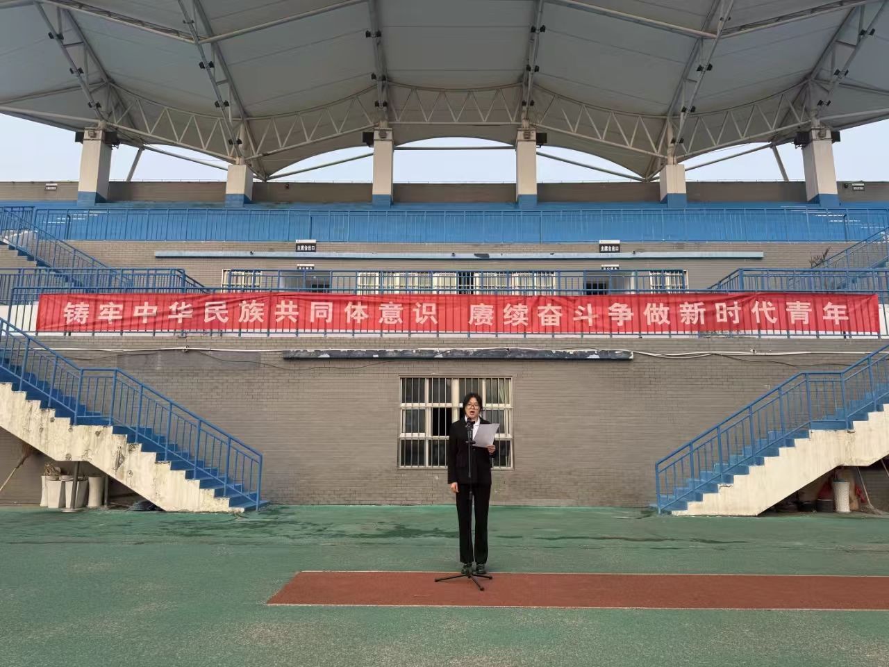 礼毕,理学院学生代表杨佩发言。她从自身生活与求学经历中感悟,祖国百年沧桑巨变离不开党的领导和全国各族人民的团结奋斗,中华文明源远流长,各族人民共同书写了灿烂的文化、共同培育了伟大的精神。她呼吁同学们以身作则,牢记“中华民族一家亲”,继续强化对中华民族的深刻认同,继续谱写更多美好的民族亲情故事。积极维护国家统一、民族团结,努力成为具有坚定信念、广阔视野和积极奉献精神的新时代有为青年。