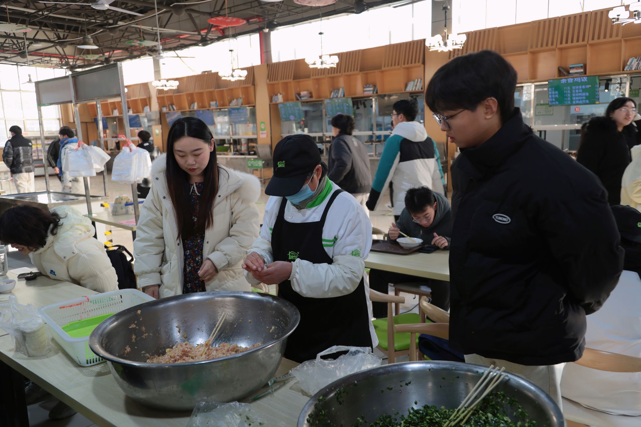 活动现场,在理学院辅导员张慧婧老师组织带领下并由食堂阿姨亲自指导同学们包饺子。大家围坐一堂,拿饺子皮、包馅、捏花样,每一个步骤都充满了乐趣。活动现场笑声不断,同学们沉浸在包饺子的快乐氛围中。张老师也积极参与到制作饺子的队伍中,与同学们分享包饺子的技巧。随着时间的推移,同学们包饺子的技艺越发娴熟,包出的饺子也越来越规范漂亮,彼此交流也越发融洽,现场气氛更加温馨。很快,一盘盘饱满诱人的饺子被摆放整齐。
