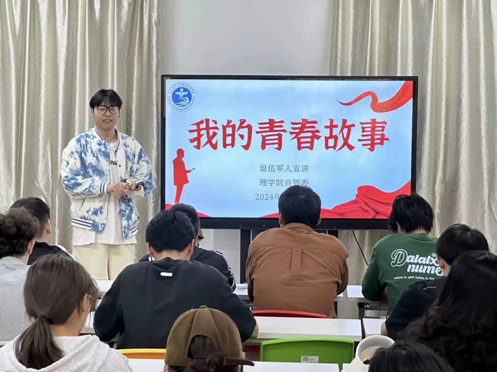 为向广大学生传递参军入伍的崇高意义,激励青年学子们投身国防事业,激发青年学子的爱国热情和社会责任感。5月16日下午,理学院于苍梧校区A7A8一站式社区开展我的青春故事系列宣讲活动,邀请了退役复学侯译然同学进行宣讲。活动由理学院辅导员张慧婧主持,部分学生代表参加。