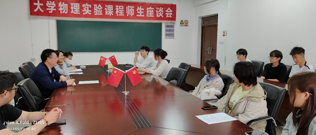 2023年5月10日下午,大学物理实验课程师生座谈会在理学院会议室举行,课程负责人王勇老师带领实验中心全体教职工、实验指导教师代表与来自不同校区、不同院系的14位学生代表进行了交流讨论。