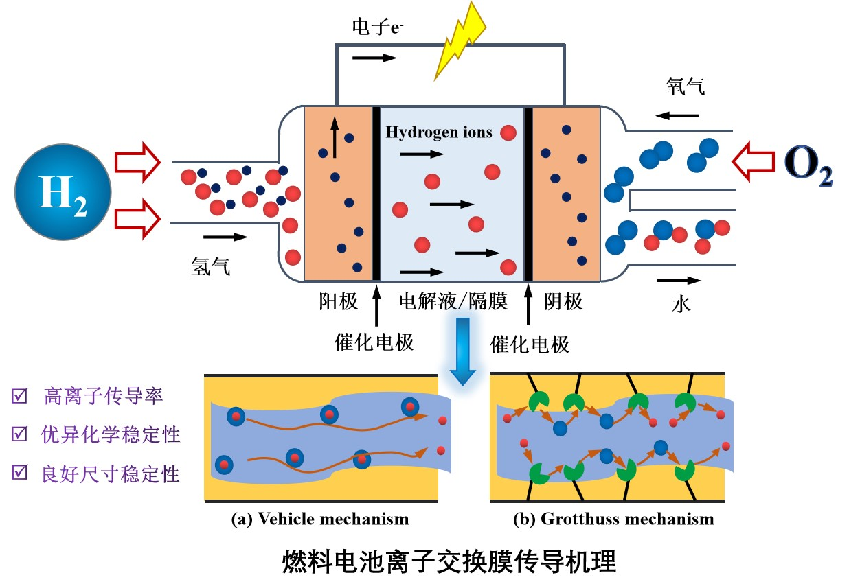 随着全球资源的枯竭和全球环境的恶化,环境友好型、可再生和高效率能源的开发受到了极大的关注。质子交换膜燃料电池(PEMFC)以其高能量密度、高效率、低污染物排放等优点受到广泛关注,被认为是电化学器件的一种很有前途的替代品。质子交换膜(PEM)是燃料电池的重要部件,其性能直接影响燃料电池的发电功率和耐久性。目前,提高PEM的质子电导率通常导致其物理化学稳定性变差,这制约了燃料电池的商业化应用。为了打破PEMs的质子传导率-稳定性的“平衡”关系,课题组提出并实施了几种提高质子传导性的策略,通过多种改性方法(包括结构改性和复合改性),开发和制备出一系列具有明显亲水/疏水微相分离结构、质子传导率高、稳定性好且满足燃料电池实际应用的PEMs,并揭示相应的质子传递机理。