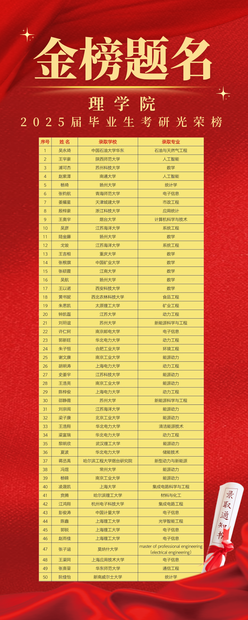 春风传捷报,桃李竞芬芳!理学院2025届毕业生在升学之路上奋力拼搏、取得佳绩,为学院高质量发展增添新动能。截止5月5日,理学院275名2021级本科毕业生中,共有50名同学成功被国内外高校录取为研究生,考研录取率18.18%。其中出国读研2人,考入双一流高校20人,新能源1211班考研率33.33%,展现了理学院学子追求卓越的青春风采!