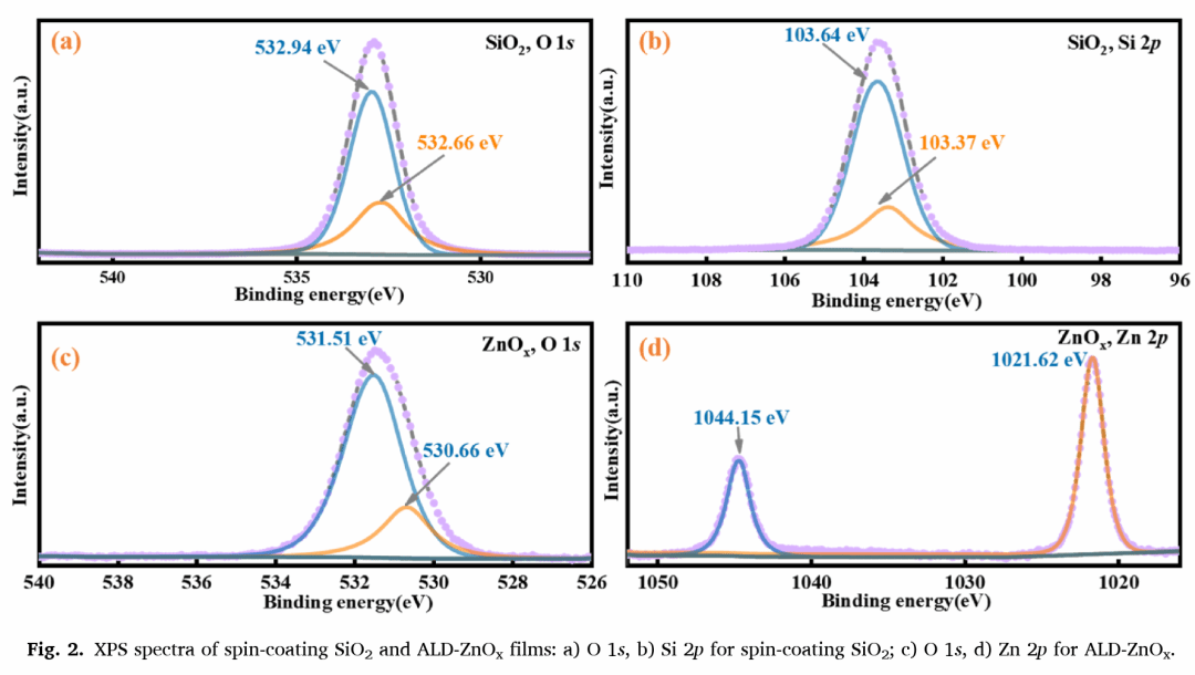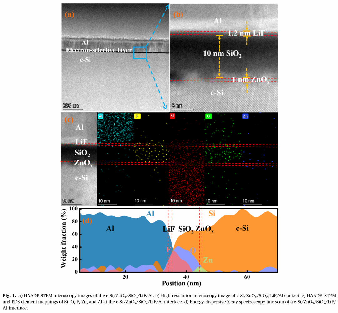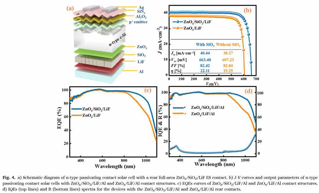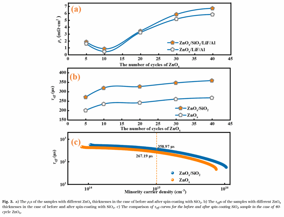 近年来,人们齐心协力开发用于晶体硅(c-Si)太阳能电池的新型电子选择性(ES)材料,旨在简化工艺并提高效率。在本研究中,我们通过将低温旋涂SiO₂与原子层沉积(ALD)ZnOₓ相结合,制备了ALD-ZnOₓ/旋涂SiO₂/LiF/Al的免掺杂电子选择性接触,并将其作为全区域背接触应用于n型c-Si太阳能电池。研究发现,具有10个周期厚度ZnOₓ的最佳ZnOₓ/SiO₂/LiF/Al样品,接触电阻率(ρc)最低,为0.857 mΩ·cm²,少数载流子有效寿命(τeff)高达319.43 μs,这表明该样品同时实现了优异的接触性能和表面钝化效果。经证实,由于旋涂SiO₂中存在针孔状载流子传输机制,旋涂SiO₂层在保持低ρc的同时,能够提升表面钝化水平。最终,采用全区域背ZnOₓ/SiO₂/LiF/Al无掺杂电子选择性接触的n型c-Si太阳能电池,获得了22.11%的最高效率。这代表了基于ZnOₓ的免掺杂c-Si太阳能电池的最佳性能,展现了这种电子选择性接触在低温、高效硅异质结以及硅/钙钛矿叠层太阳能电池中的广阔前景。