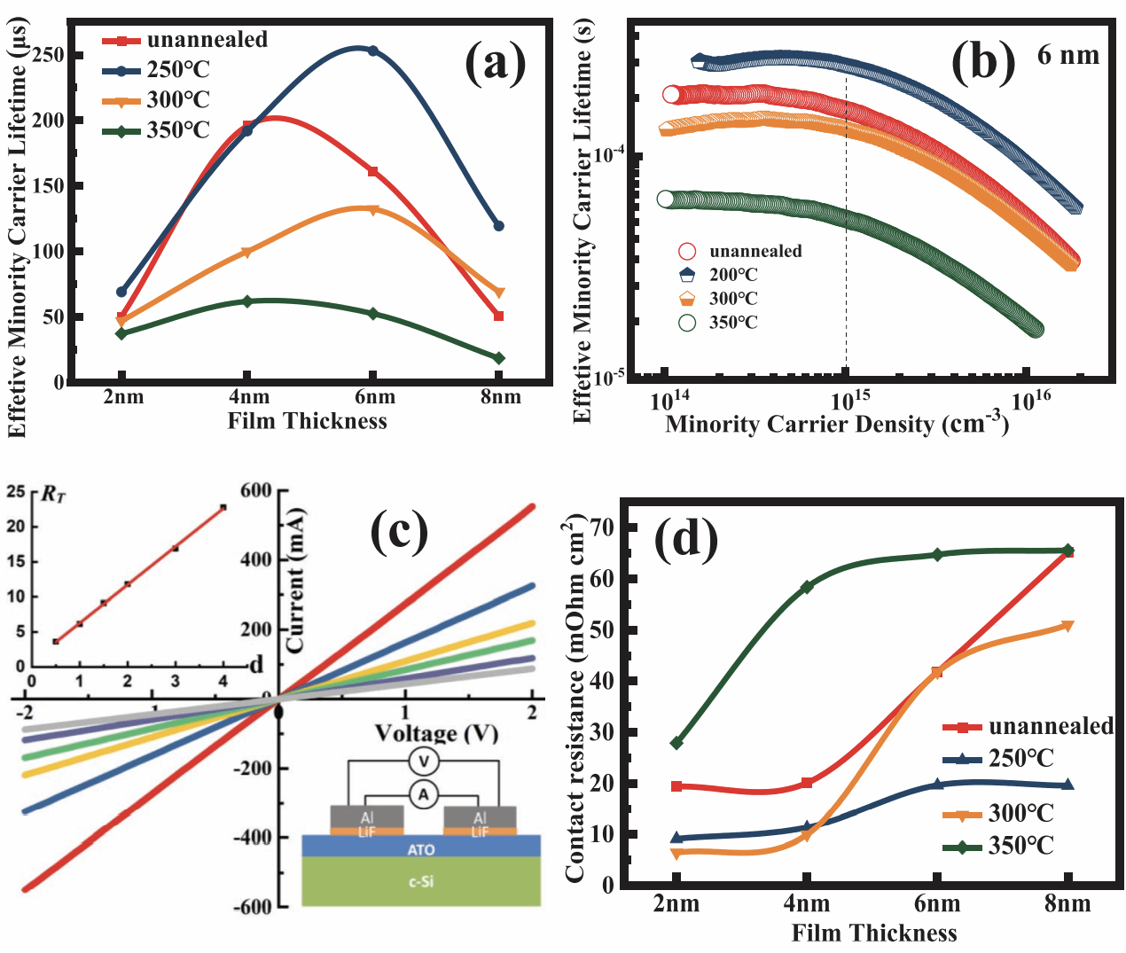 通过载流子选择性接触(CSCs)形成非对称的电子和空穴传输成为近年来解决硅与金属电极接触处复合的重要方法。江苏海洋大学刘莹(第一作者)、黄增光教授(通讯作者)等成功地制备出了基于低温原子层沉积技术的Al掺杂TiO2(ATO)薄膜,并将其作为电子选择性接触薄膜应用于硅太阳电池上,不仅实现了低温掺杂(150 ℃),而且同时获得最高为253.0 μs的少数载流子寿命和19.7 mΩ cm2的低接触电阻率,表明ATO/LiF/Al层具有良好的电子选择特性。该工作为实现低能耗的高效晶硅太阳电池提供了新途径。